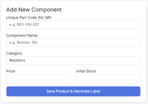 The heart of the system is the Inventory Manager. Every part, from a 10k resistor to a heavy-duty inverter transformer, is assigned a unique barcode. What sets AtifTech Shop apart is the Branded Label Generator. The system creates professional labels featuring the "ATIFTECH" brand, the item name, and a scannable QR code. By pasting these on component drawers, shop owners can identify and scan parts in seconds, eliminating the "search and find" struggle.